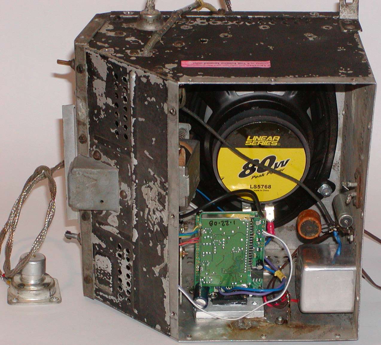 The owner wanted to keep his car as a 6 volt system so a 6 to 12 volt inverter was added. It can be seen in the lower right corner. The new 80 watt speaker is in the background with the new AM/FM conversion electronics located in the bottom middle of the radio, fully integrated.
