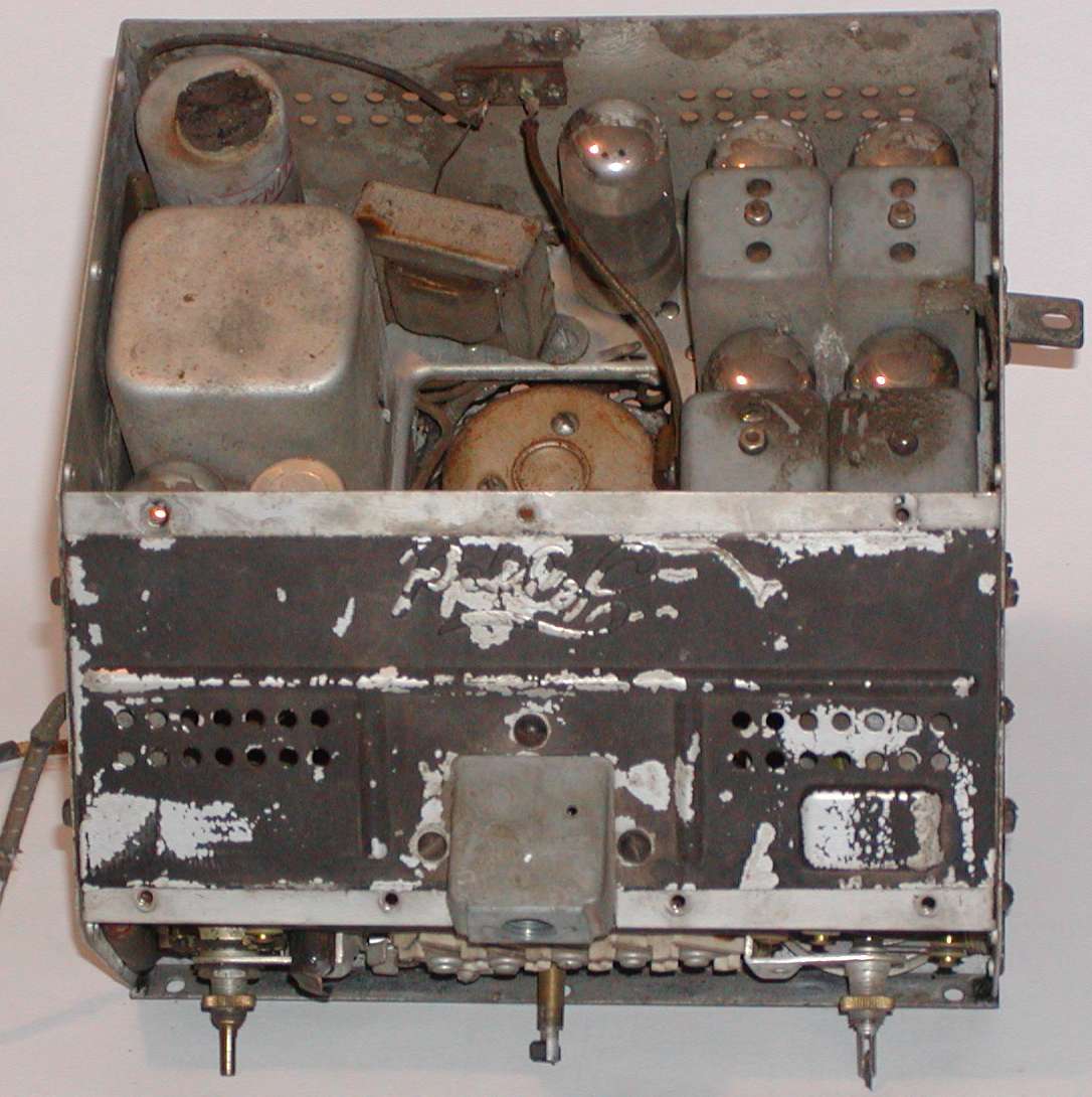 The original 'innards' of the radio. The tubes are the loctal type which predates octal and miniature tubes of the 50's and 60's. Note the speaker placement on the bottom. You can see it's magnet in the middle.