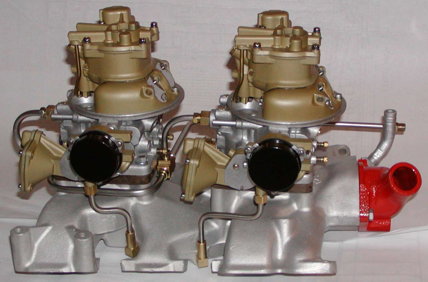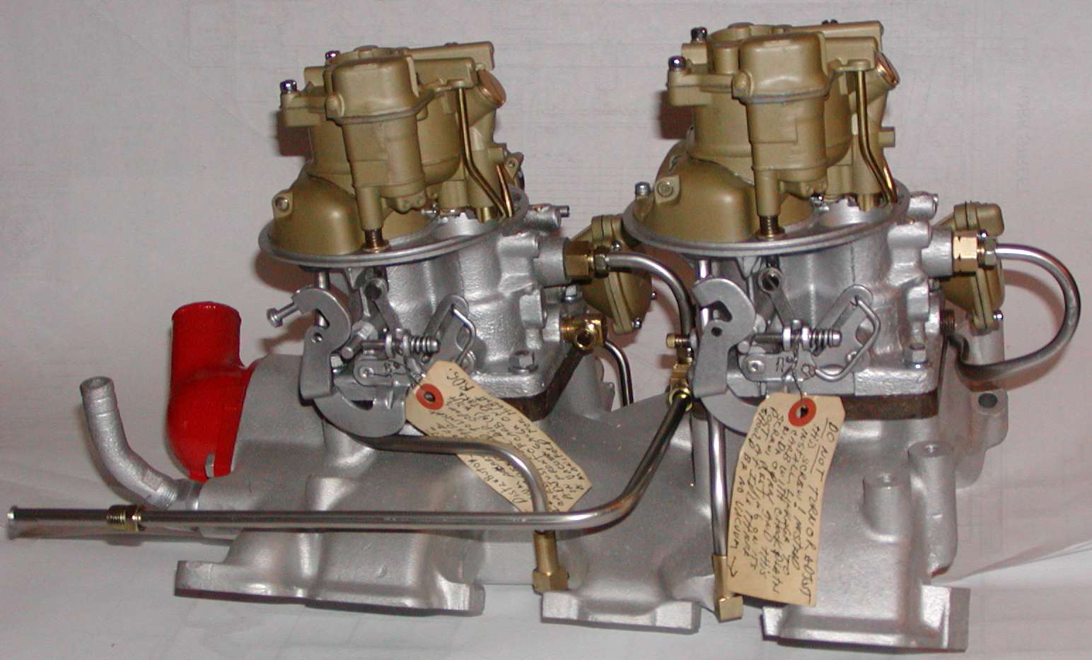 Shown below is a restored correct setup as supplied by Ford. Note that the Thunderbird used the same parts but turned the carburetors 180 degrees for hood clearance requirements.
